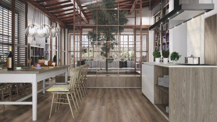 Также очень необычно смотрится и расширяет комнату прием, когда оформляют пол и одну из стен одинаковым ламинатом. Он часто используется декораторами на кухне, чтобы отделить место приема пищи от рабочей зоны.