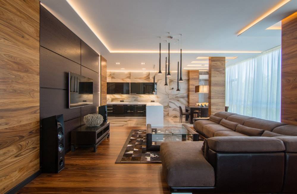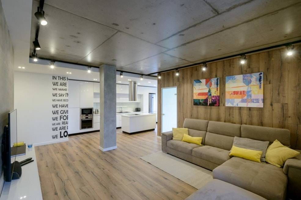 Для отделки колонны в центре гостиной использован ламинат