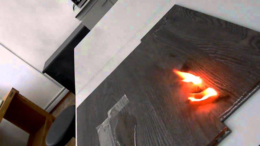Благодаря пропитке всех слоев ламината специальными смолами, материал не подвержен возгоранию. При длительном воздействии открытого огня ламинат меняет свою структуру и плавится, но пламя не поддерживает. Конечно, при производстве самых дешевых классов, производитель может сэкономить на качестве, в таком случае все описанные свойства ламинат может не иметь. В бытовых же условиях, при случайном падении горящей спички или пепла никого воздействия на ламинат не произойдет.