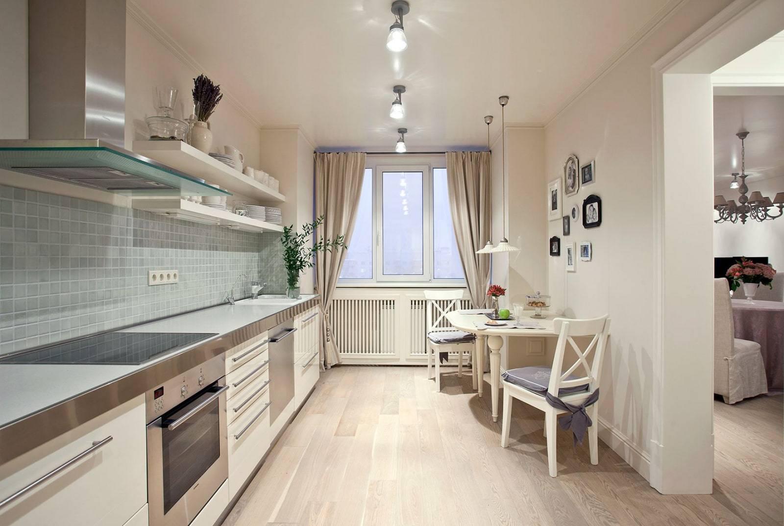 Коридорная часть квартиры освещена искусственно, поэтому уместным будет использование белых и светлых тонов пола, стен и мебели.