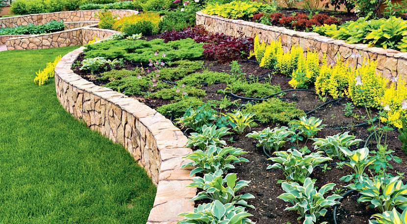 - В нижней точке стараются высаживать высокорослые культуры. Они помогают сгладить перепад высот.