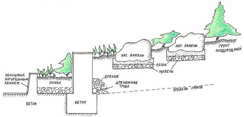Выкладка уровней в альпийской горке выполняется крупными булыжниками с похожей структурой. Такое сооружение поднимается на несколько уровней с небольшой высотой. Слой дренажа должен получиться одинаковым для любой террасы, но не более 40-50 см.