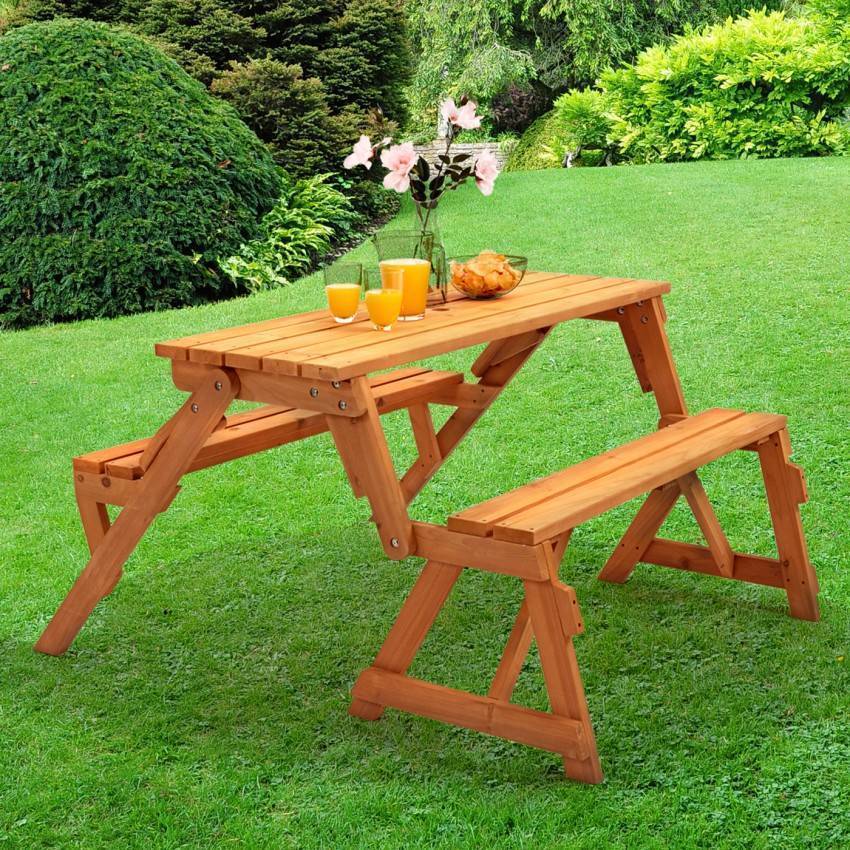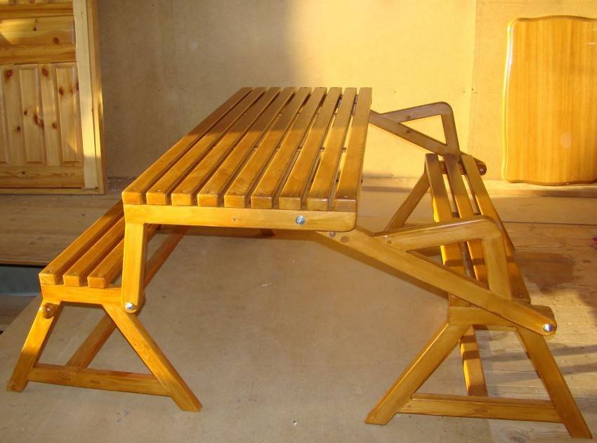 Можно выделить еще один интересный вариант – это лавка со спинкой, которая трансформируется из стола со скамейкой. Такой вариант идеальный для беседок.