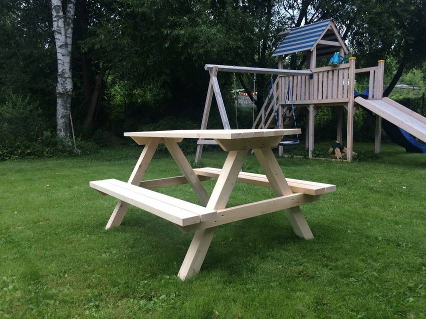 Удобный и практичный столик с парой скамеек пригодится на любой даче
