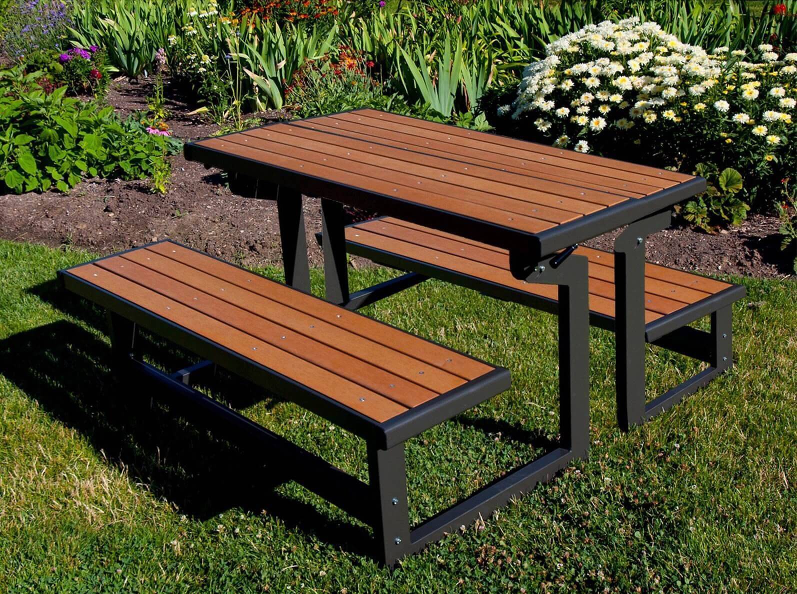 Это складная конструкция, которая отличается малым весом. Таким образом значительно облегчается задача переноса скамейки с одного места на другое: в летний период – в тень, осенью или весной – в солнечные места. Оптимальный материал – пластик.
