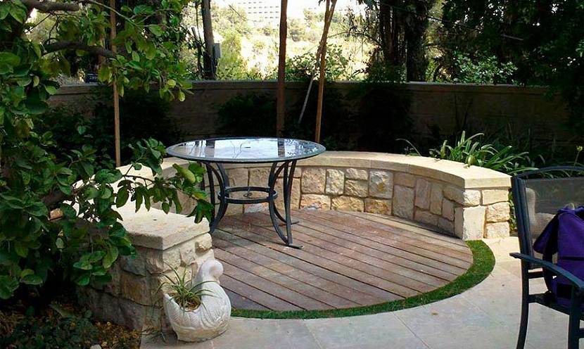Для сиденья следует использовать обработанные доски или половину оцилиндрованного бревна. Выбор сырья зависит от того, в каком стиле выполнен дизайн сада или дворика. Закреплять сиденье рекомендуется металлическими уголками, фиксируемыми к бетону с применением дюбелей, а к древесине с помощью сквозных болтов или саморезов.
