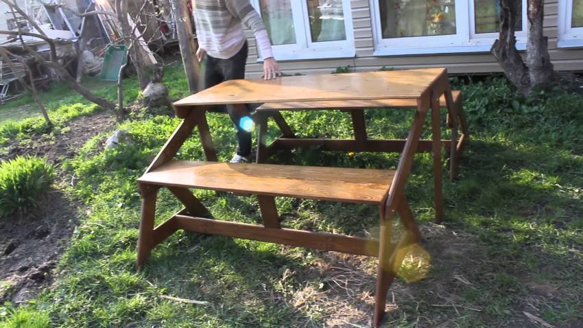 Если ваши руки, растут откуда надо и вы любите работать с деревом, можете попробовать сделать интересный объект, который из двух скамеек, трансформируется в стол и две лавочки. Необходимое количество материалов и подробные чертежи лавочки-трансформера, легко найти в интернете. Следуя этим инструкциям, вы быстро осилите изготовление этого предмета.