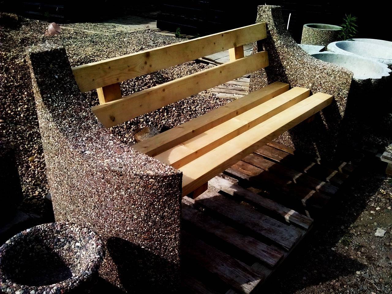 Конструкции из древесины имеют определенный недостаток. Материал сам по себе требует постоянного ухода, а в данном случае дерево еще и соприкасается с почвой, периодически необходимо выполнять полив растений. Чтобы сделать лавочку более практичной, деревянные ящики можно заменить бетонными или каменными тумбами. Клумбы из бетона можно сделать самостоятельно или приобрести в магазине.