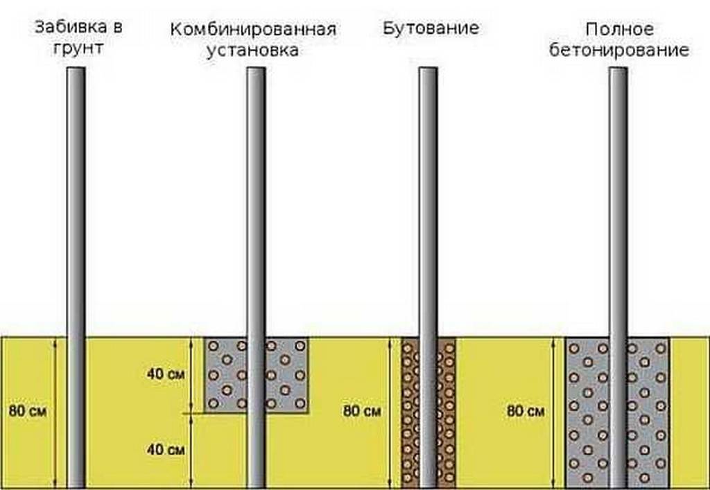 Столбовой фундамент представляет собой вбитые или вкопанные в грунт опоры. Располагают их на расстоянии в 1,5 м. Глубина вкапывания зависит от особенностей грунта и массы ограждения. Могут достигать и 1,5 м. Может применяться на разных грунтах. Как правило, выбирается для обустройства забора из профлиста.