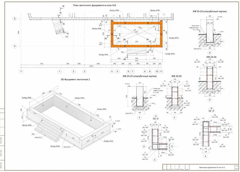 Любое капитальное сооружение требует создания сложных сборных или монолитных оснований. В большинстве случаев полный план ленточного фундамента не умещается на одном чертеже. Кроме того, наличие вышеупомянутых сложных узлов требует их подробной разработки и дополнительной расшифровки.