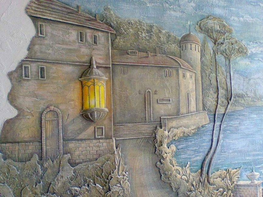 С помощью барельефа можно спрятать неровности на стене, и превратить из недостатков элементы декора. Также, за лепкой можно спрятать инженерные коммуникации. На голой стене можно создать цельную картину, пейзаж, который будет перетекать в красивую декоративную штукатурку.
