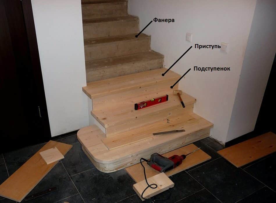 В отмеченных местах проделывают отверстия и заполняют их эпоксидной смолой. В заключение крепят подступенок. После этого на фанеру с клеем кладут проступь с прикрепленным к ней очередным подступенком. Чтобы изделие лучше приклеилось, рекомендуется использовать груз.