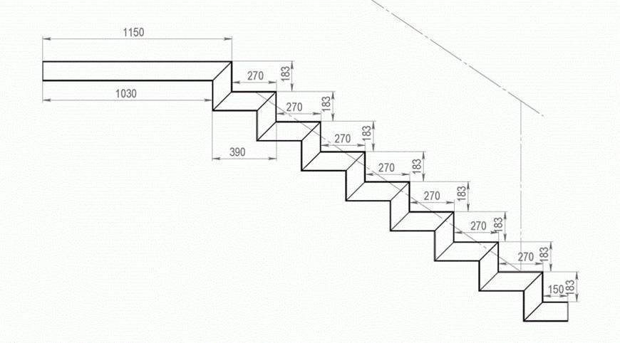 Длина марша выведена математическими исчислениями. Теперь необходимо подсчитать, сколько ступенек поместится на этом отрезке. К примеру, если длина марша равна 3 м, а глубина ступеней выбрана 30 см, то лестница из профиля, собираемая по данным параметрам, поместит в себе 10 ступенек.