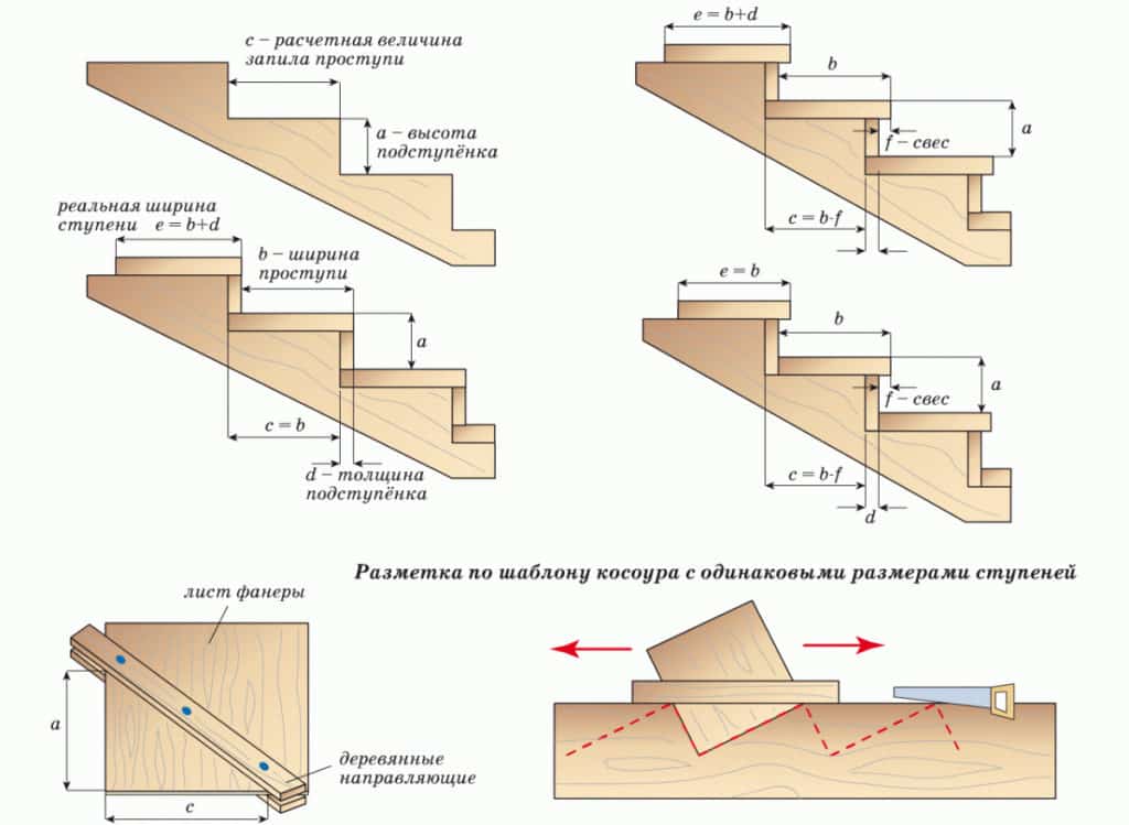 Проступи вырезаются из доски по ранее заготовленному шаблону. Стандартная их толщина варьируется от 30 до 40 см. Если сделать больше, то это будет неоправданный расход материалов и утяжеление конструкции. Подступенки выполняют в сооружении декоративную функцию. Поэтому на них можно сэкономить, используя доску 10-15 мм.