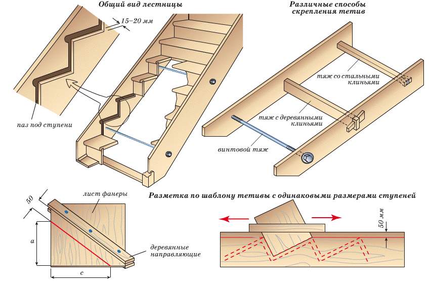 Установка деревянной межэтажной лестницы начинается с изготовления косоуров (или тетив), проступей и подступенков.