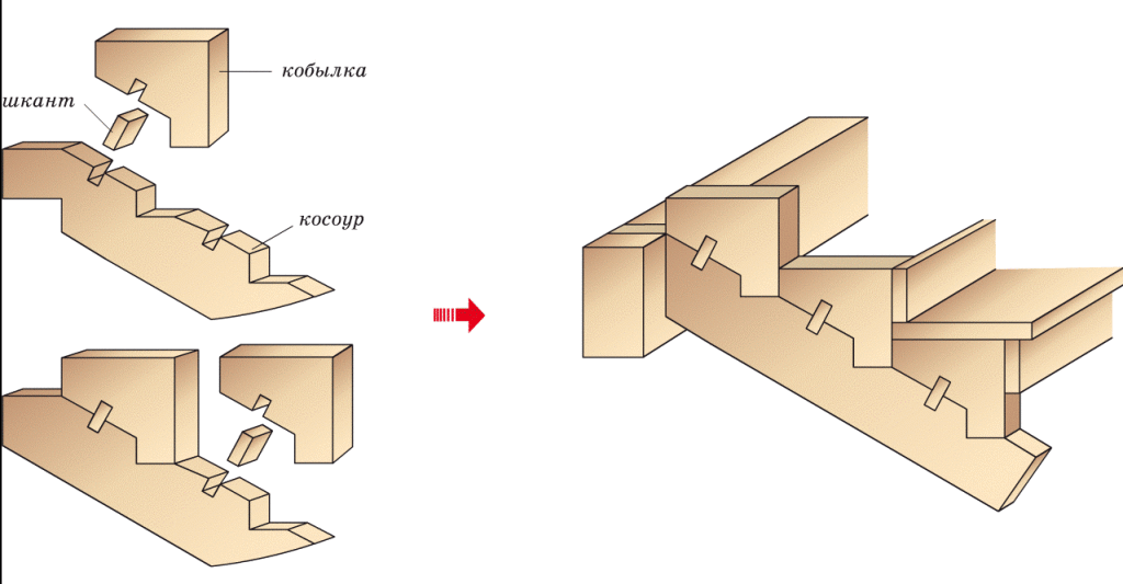 Детали покупают готовыми или изготавливают самостоятельно. Доски раскраивают по размерам проступей и подступенков, прикручивают к каркасу болтами с гайкой и шайбой, саморезами, футоркой, мебельными болтами или крепежом Фишер.