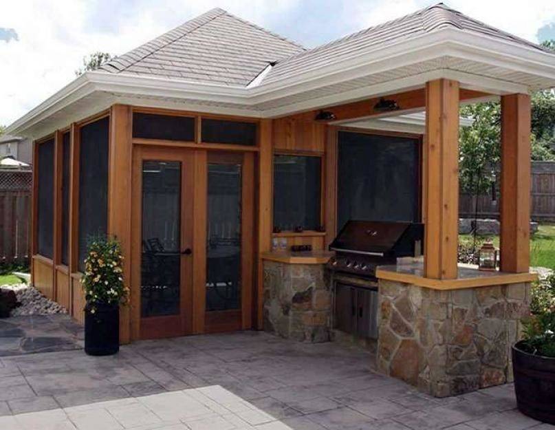 Этот вариант, пожалуй, наилучшее сочетание всех достоинств двух предыдущих вариантов. Это союз компактного закрытого помещения, которое состоит из функциональной зоны и открытой для приема пищи. Здесь располагаются стол, стулья, мангал или барбекю. Обеденная зона может быть укрыта навесом, а стены можно закрыть вьющимися растениями. Это обеспечит тень и прохладу в знойную погоду. Если бюджет ограничен, то можно оформить эту зону в стиле патио, то есть гости сидят под открытым небом.