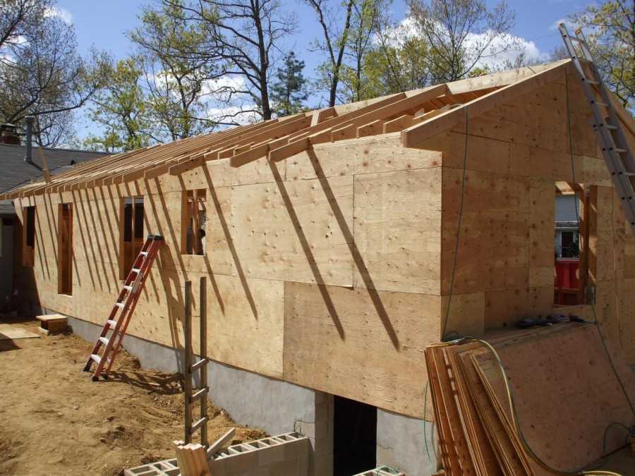 Далее монтируют вертикальные стойки, крепко упирая в брусковую решетку. Готовый каркас обвязывают и поверх него кладут чердачные лаги. Дальше идет работа по обшивке каркаса деревянными плитами. На этом этапе оставляют отверстия для окон и дверей.