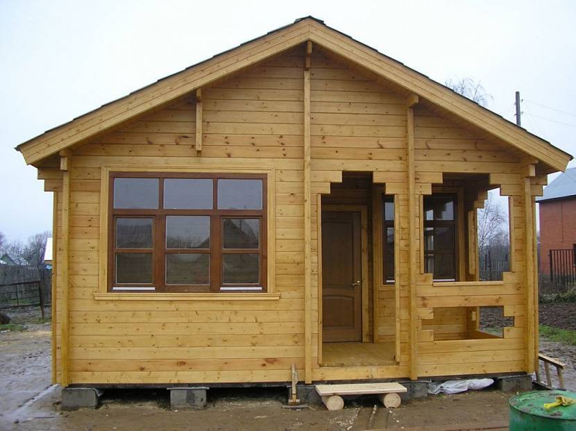 Снабженный крыльцом под навесом небольшой деревянный домик 5х3 м предлагается за 99000 руб. Более просторный деревянный дом с небольшой верандой и отделкой из имитации бруса потребует вложений от 270000 руб.