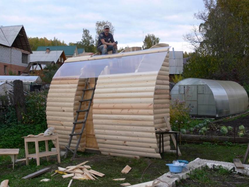 Закругленная крыша обшивается согнутым и уложенным на дуги каркаса листом.