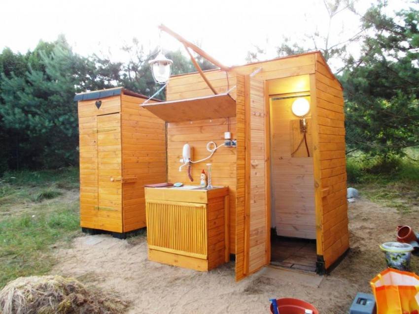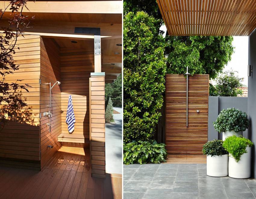 Деревянная кабинка – популярный и распространенный вариант. Это связано с тем, что она очень проста в исполнении. Для строительства используется экологически чистый материал, который обладает многими достоинствами. Единственный недостаток – низкая устойчивость к влаге и насекомым. Поэтому деревянные элементы подвергаются обработке антисептиками. Для строительства используют брус и доски. Оптимальным вариантом станет древесина хвойных пород, так как она обладает высокой устойчивостью к влажной среде.