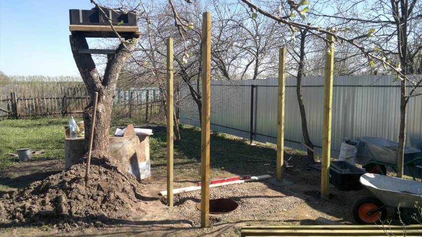 - Чтобы защитить брус от гниения в земле, его обмазывают битумом и обматывают рубероидом. После этого они устанавливаются в яму и выравниваются по уровню. Дополнительные стойки устанавливаются в местах монтирования дверей.