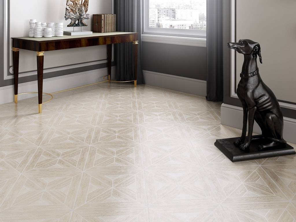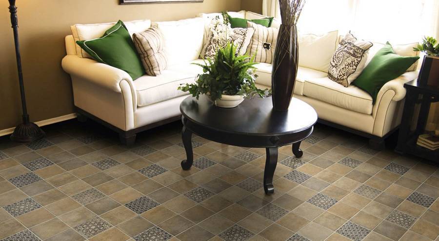 Среди многообразия вариантов можно выбрать линолеум с фактурой керамической плитки, деревянного паркета, каменной плиты или с абстрактной композицией
