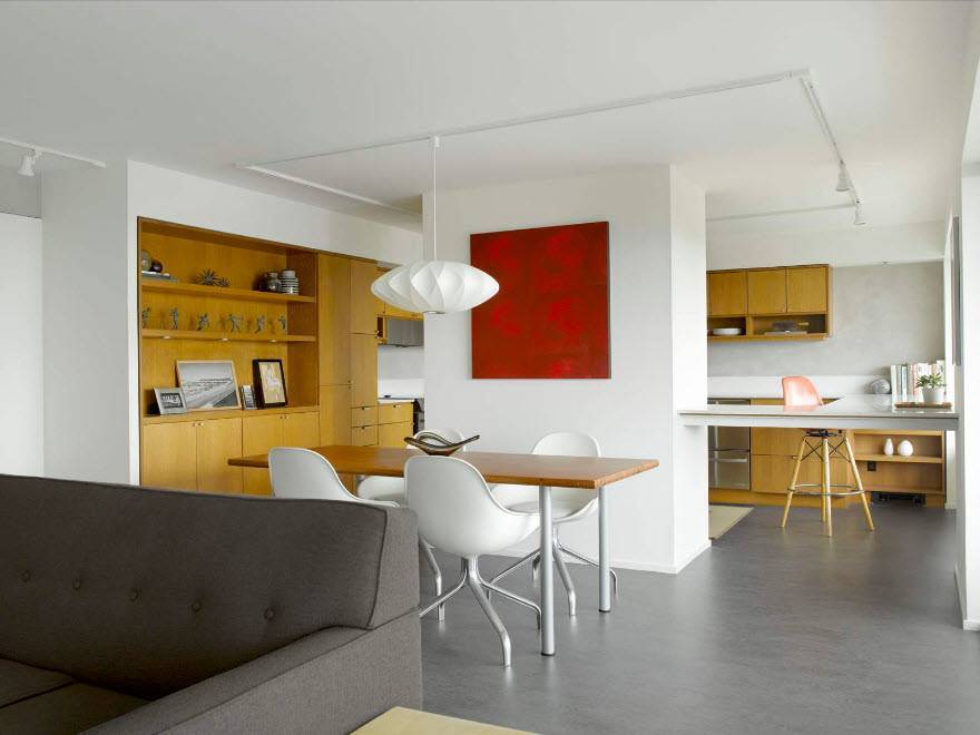Классический тандем серого и белого в данном интерьере выглядел бы скучно. Но ситуацию спасли яркие детали. Последние, кстати, несмотря на свою насыщенность, не выглядят вульгарными и кричащими благодаря все тому же серому полу.