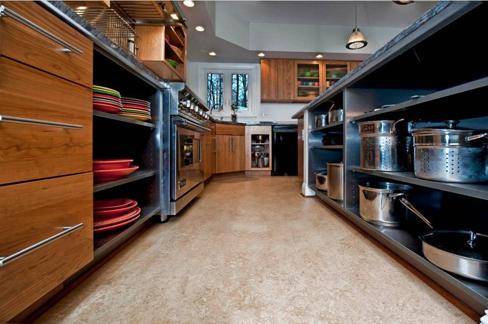 Как правило, на кухне и в коридорах стараются стелить устойчивый к влаге линолеум, клеить керамогранит или укладывать влагостойкий ламинат. Разнообразие рисунка позволяет варьировать при выборе окраски стен и фасадов мебели.