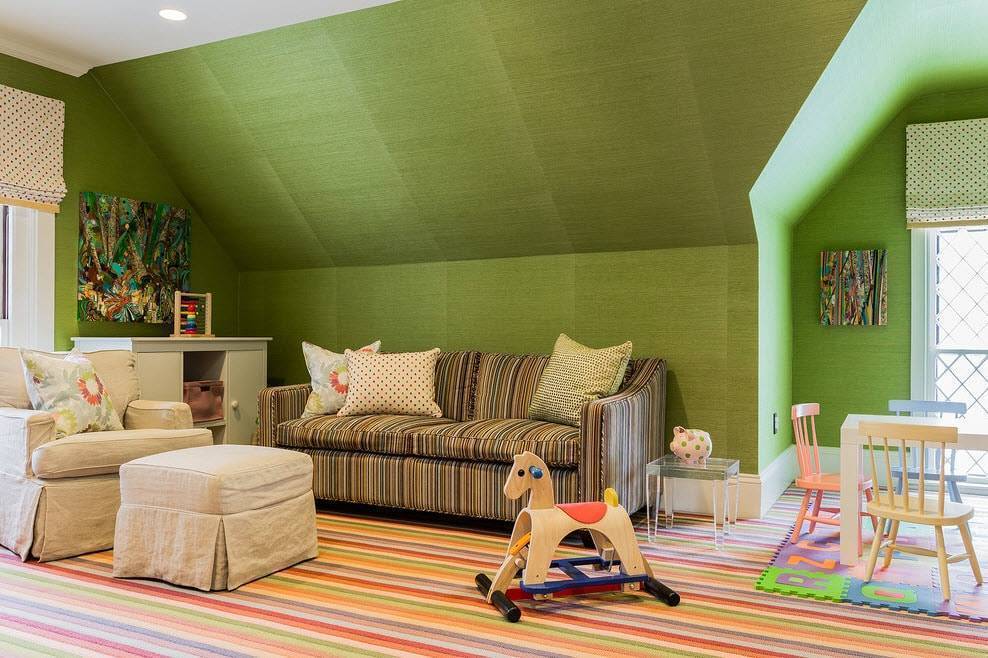 - вертикальные полосы приподнимают низкие потолки, эффект увеличивается с шириной полосы;