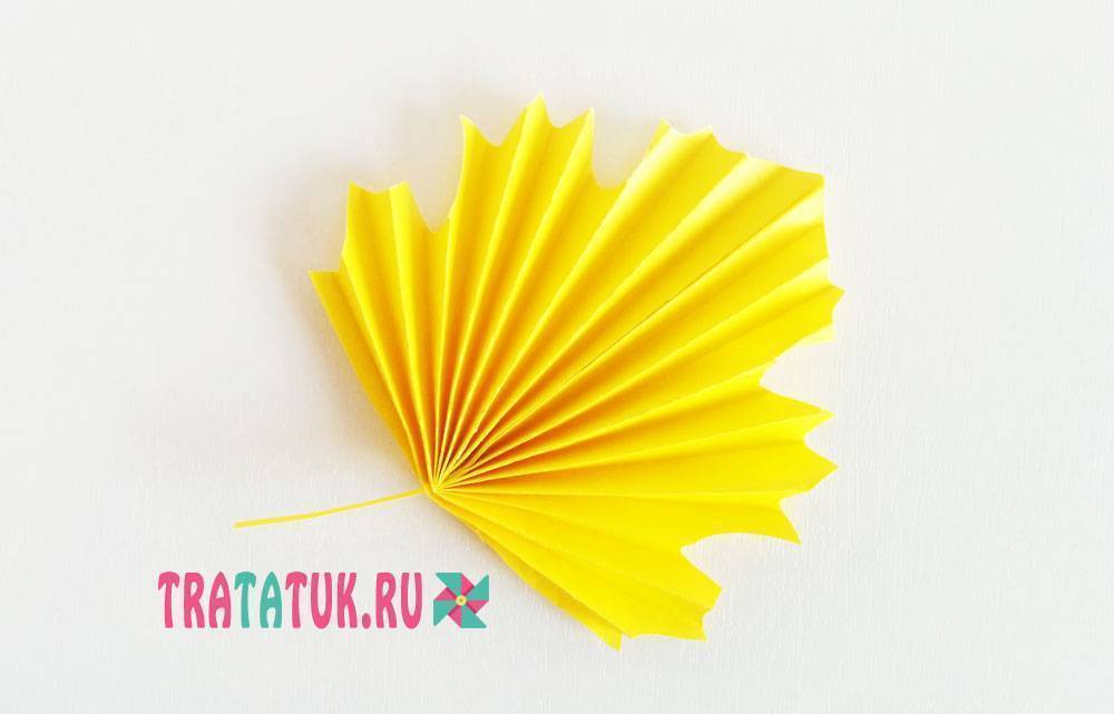 Немного расправьте складки, приклейте стебелек и красивый, в данном варианте осенний кленовый лист гармошкой готов.