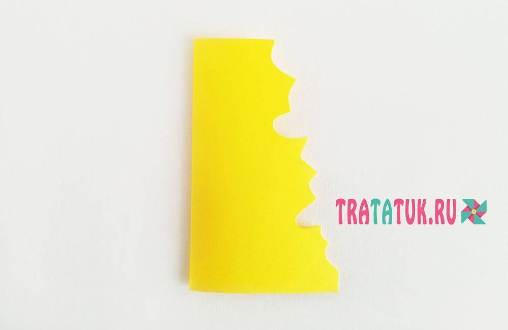 Далее нужно вырезать все нарисованные зигзаги и углубления, не трогая левую сторону. Если лист маленький, подобная работа довольно скрупулезная, для вырезания лучше воспользоваться маникюрными ножницами.