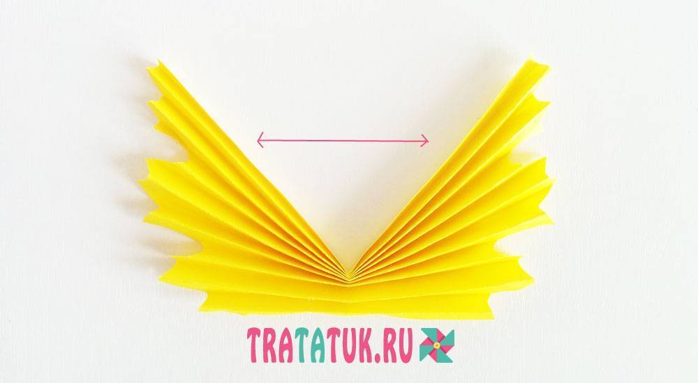 Найдите серединку и сложите вдвое сложенную в гармошку бумагу. Вот здесь видно, что эта желтая бумага более тонкая, в сравнении с предыдущими, в самом низу складки не удерживаются вместе. Поэтому их нужно заставить это сделать с помощью клея. Можно смело нанести клей в месте сгиба на трех нижних складках. И, конечно же, склеить внутренние две стороны, там, где показано стрелочками.