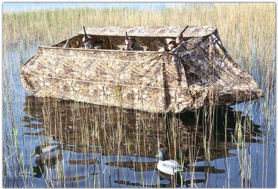 Моторную лодку принято загонять в островки тростника, которые окружают чучелами. Птица чутко реагирует на любой блеск, и чтобы повысить результативность охоты, на жесткий корпус наносят краской характерные пятна, сопоставимые с оттенком естественной растительности. Чтобы камуфлирующее покрытие сохранилось как можно дольше, можно опрессовать корпус сетчатой тканью с уже готовым рисунком.