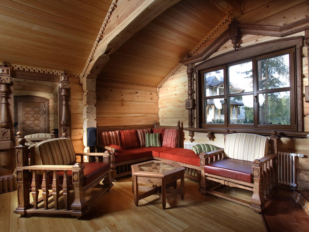 Дизайн домов в русском стиле состоит из правильно подобранной мебели. В большинстве случаев это габаритные конструкции из древесины, которые можно украсить красочной тканью. Диваны и кресла можно будет обшить велюром, а ножки столов – оформить резьбой. Стильно будет выглядеть имитация состаренного материала. Шкафы в таком стиле должны быть крупными и просторными, но в то же время иметь не много отделов.