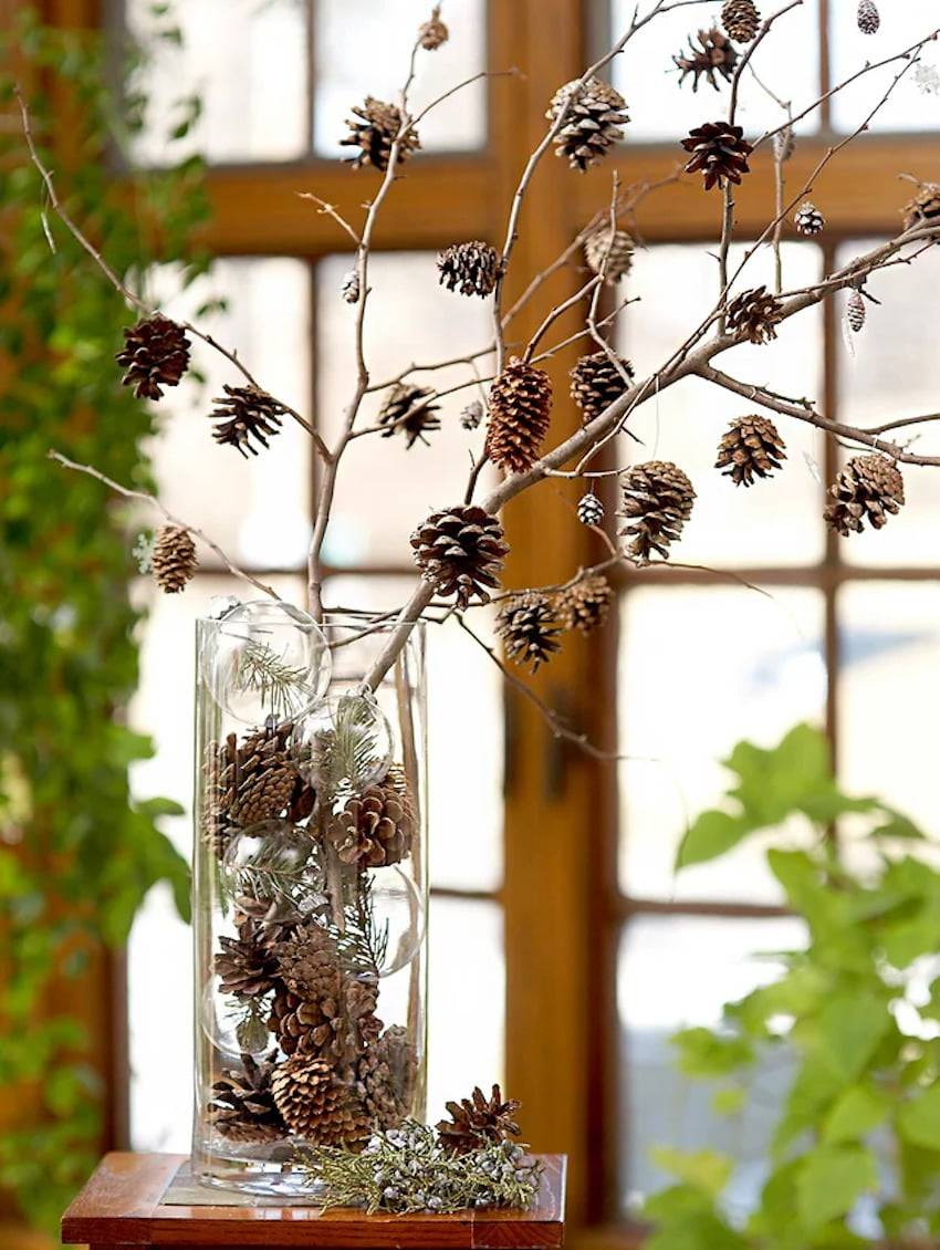 Необычное применение ветки и шишек в качестве декора