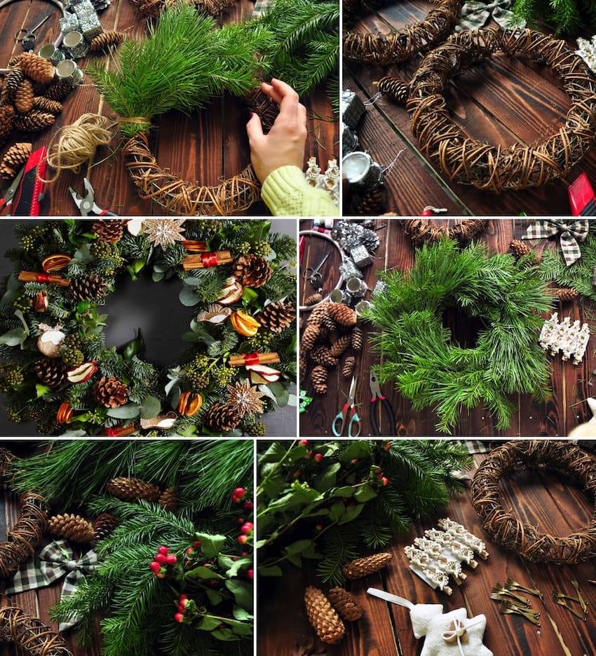 Самый простой способ сделать венок из веток ели и шишек – соединить их с заранее подготовленным круглым каркасом из металлической проволоки