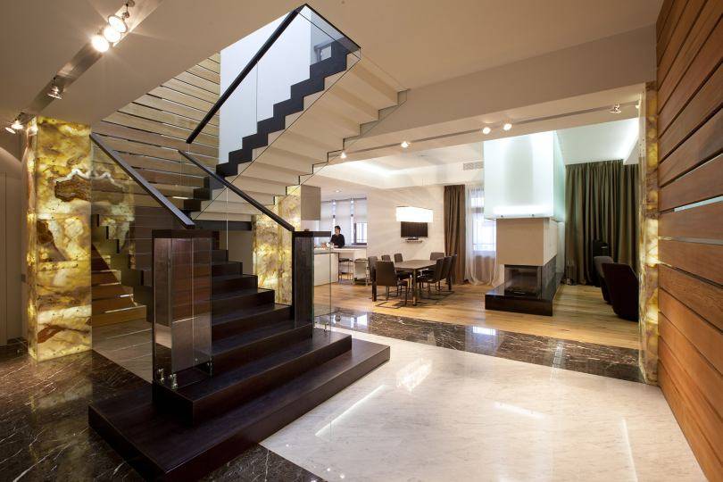 В качестве украшения классического интерьера, если посмотреть фото дизайна коттеджа могут стать лестницы из камня или дерева. Как напольное покрытие лучше всего выбирать паркет.