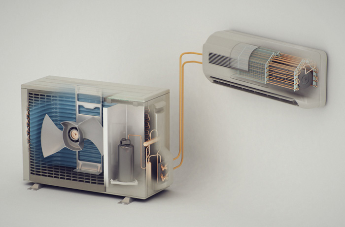 Подобно работе тепловых насосов, кондиционер обычно состоит из компрессора и конденсатора. Принцип его работы прост: он всасывает воздух, охлаждает его, а затем рассеивает его по комнате.
