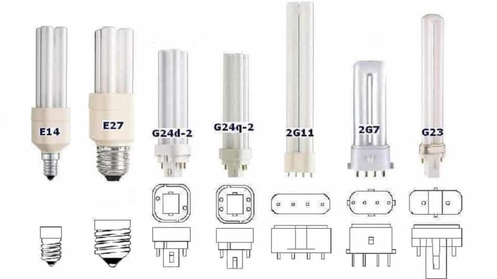 Цоколи могут быть штырьковые или резьбовые. В первом случае обозначение имеет вид G23, G24, G27 или G53. Число обозначает расстояние между штырьками. Резьбовые цоколи бывают с маркировками E14, E27 и E40. Здесь число определяет диаметр резьбы.