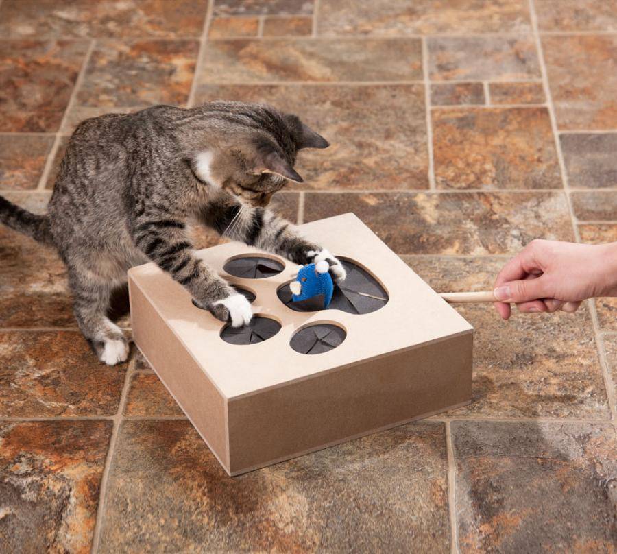Питомцу обязательно понравится самодельная головоломка из картонной коробки. В корпусе делают несколько отверстий с разных сторон. На крышке коробки также вырезают равные по размеру отверстия. Они не должны быть слишком большими, чтобы в них проходила только лапки питомца.