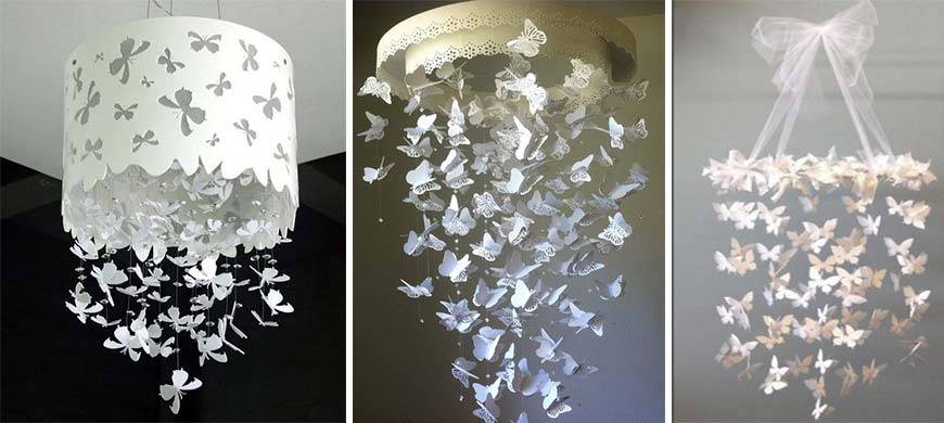 - Вы так же можете попробовать интересный вариант, если сделаете проволочный шар! За основу в нем следует взять подвес из люстры и расположить на нем при помощи клеевого пистолета несколько шаблонов бабочек.