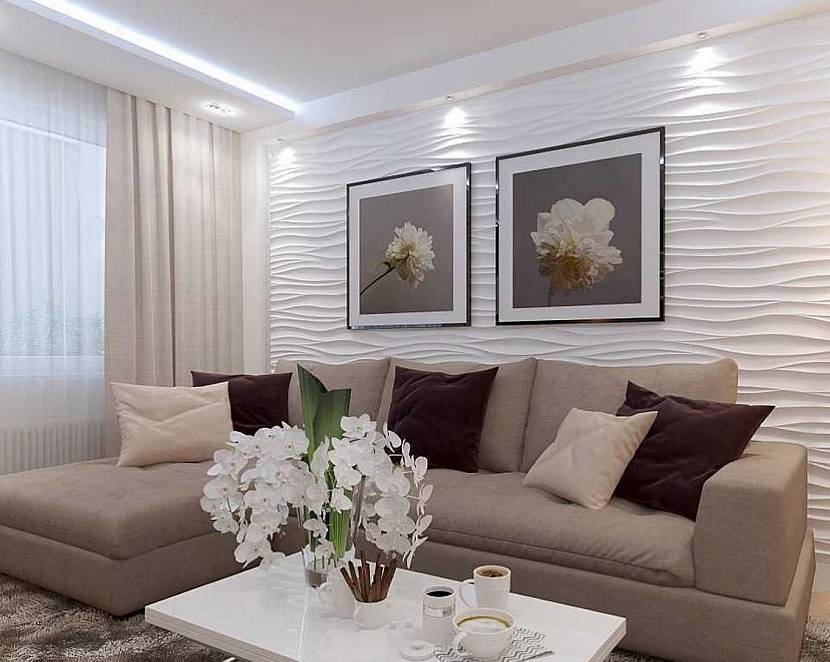При оформлении зала в светлых оттенках для стен используют виниловые или флизелиновые обои. Универсальный отделочный материал может быть как однотонным, так и с неброским рисунком (фактурой). Дизайнеры часто выбирают рельефное сырье под покраску. В классических комнатах роскошно смотрятся интерьерные ткани и декоративная штукатурка.