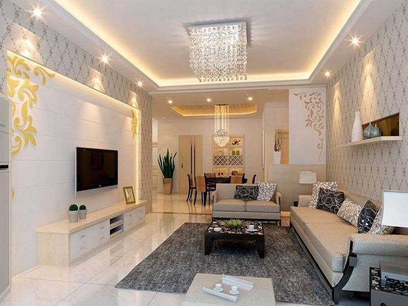 Дизайн гостиной в светлых тонах нужно правильно осветить. Искусственные источники света подбирают в единой стилистике. По периметру потолка монтируют точечные элементы, в центре – люстру