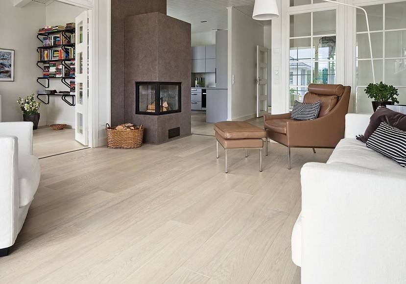 От цвета и материала покрытия зависит настроение комнаты. Традиционно на пол кладут ламинат, паркет натурального древесного оттенка – береза, ясень или бук. В светлой гостиной красиво смотрится доска темного тона – орех, махонь или тик. В белом помещении обыгрывают контрасты черного – мореный дуб или венге.
