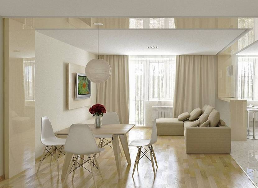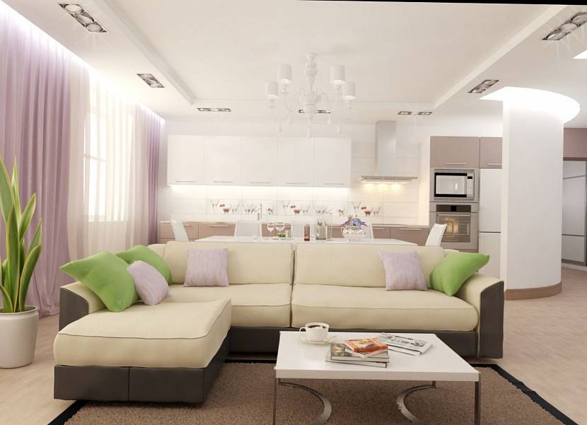 Зонирование обязательно при объединении кухни с залом. Светлый дизайн интерьера гостиной отделяют от помещения для приготовления пищи при помощи мебели. На границе ставят легкий стеллаж или шкаф со сквозными полками. Оригинально смотрится угловой диван, разделяющий две комнаты. Предметы не мешают передвижению, но создают четкое деление на части.