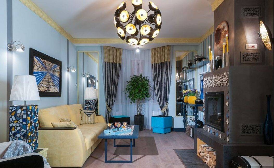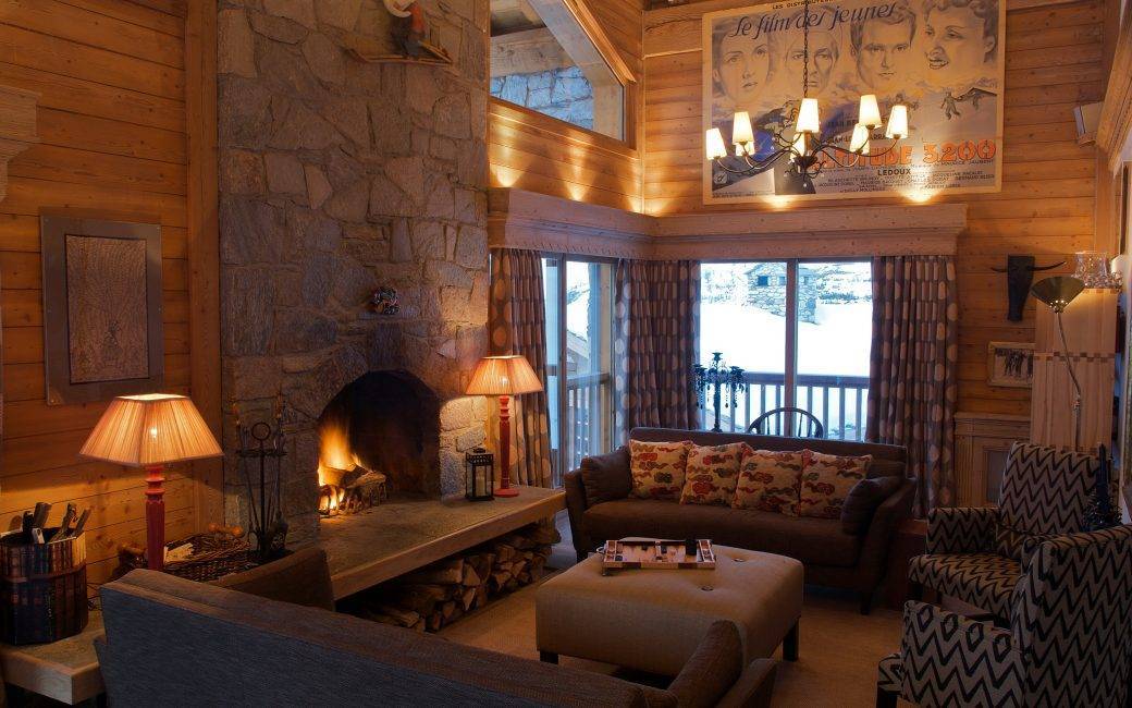 Уютную атмосферу поможет создать камин, он может располагаться как в центре комнаты, так и в любой из его зон.