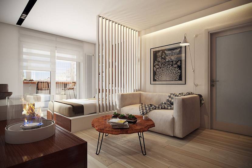 Если зал соседствует со спальней, тогда зонирование проводят при помощи перегородок. Полустены визуально исключают участок с кроватью из области видимости. На границе дизайнеры рекомендуют ставить мобильные ширмы или драпировки на рельсах.