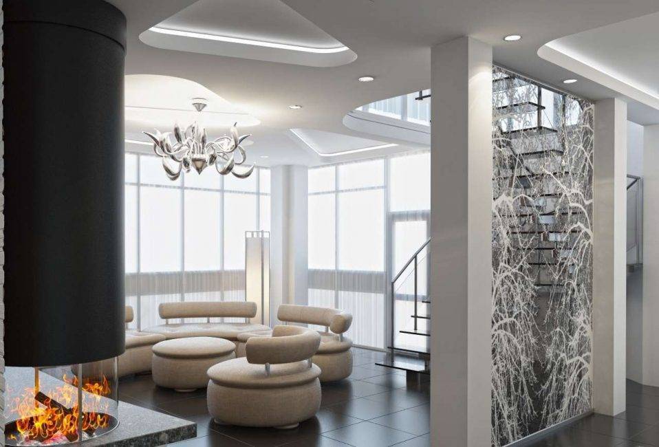 Люстра в зале считается центральным элементом, украшением потолка, и если необычно оформлен потолок, то необычно и дорого будет выглядеть композиция.