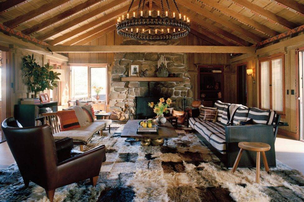 Полы из дерева или же бетона, табу на большие ковры. В крайнем случае, это может быть небольшого размера коврик, на котором можно удобно устроиться у камина или телевизора. Стены, как уже отмечалось, остаются без какого бы то ни было покрытия: здесь можно лицезреть: